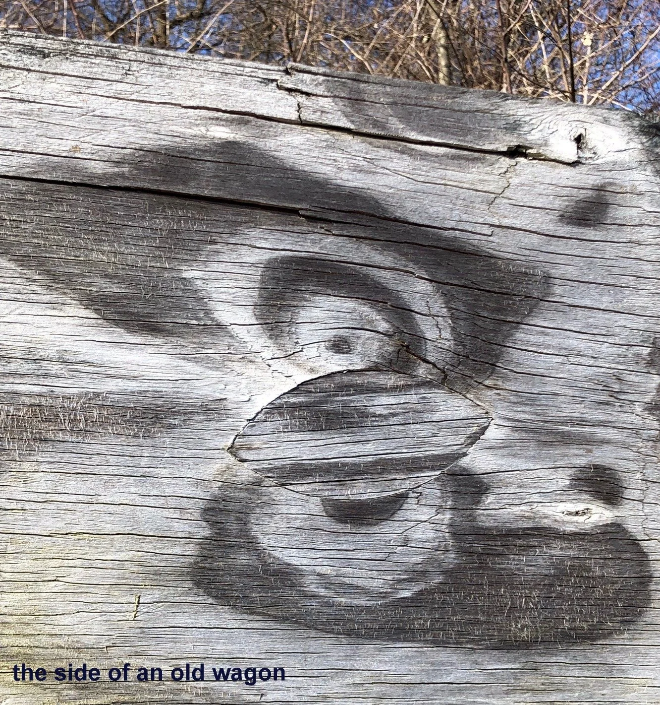This is the side of a weathered, wooden-sided trailer. A Happy Cyclop